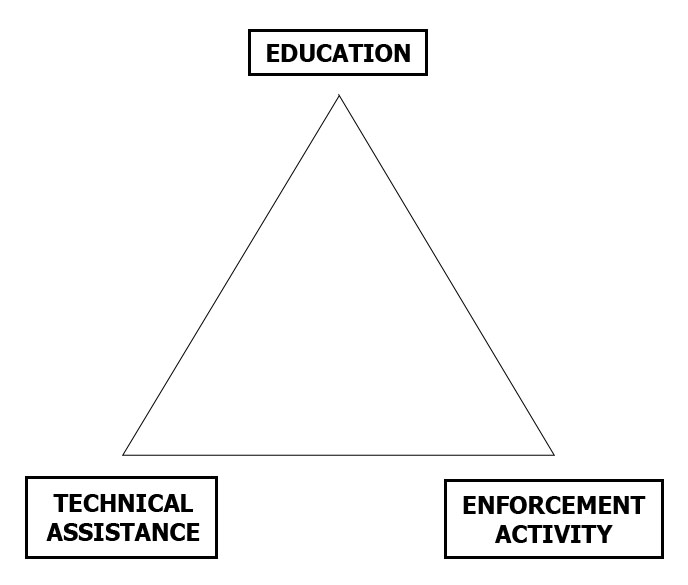 OCA performs its functions by way of a three-pronged approach through education, technical assistance, and enforcement activities to meet its goals.