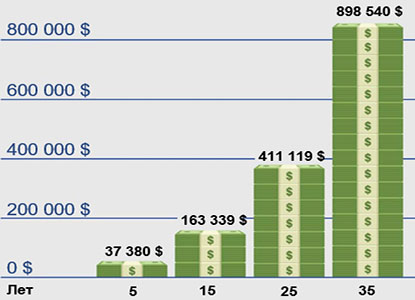 Начните сейчас! На графике показано, что Вы сможете накопить за 5, 15, 25 и 35 лет, откладывая ежегодно по 6 500 долларов и получая 7% годовых.