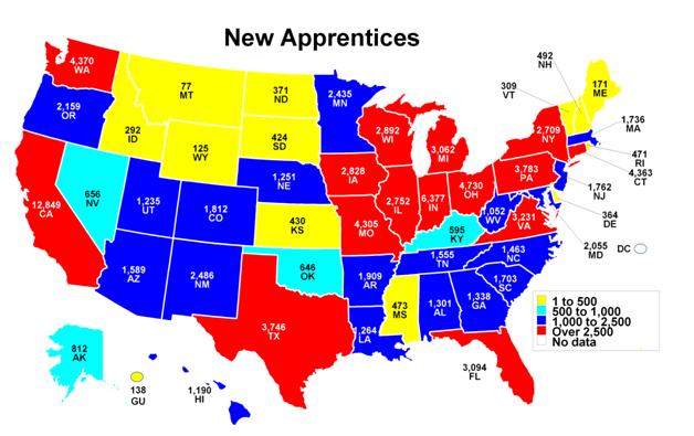DATA NOTE: US DOL's Office of Apprenticeship uses a combination of individual records and aggregate state reports to calculate national totals as depicted on this webpage. The Registered Apprenticeship Partners Information Management Data System (RAPIDS) captures individual record data from 25 Office of Apprenticeship (OA) states and 8 of the 25 State Apprenticeship Agency (SAA) states. For SAA states that manage their data outside of RAPIDS, information is provided in the aggregate to US DOL on a quarterly basis.