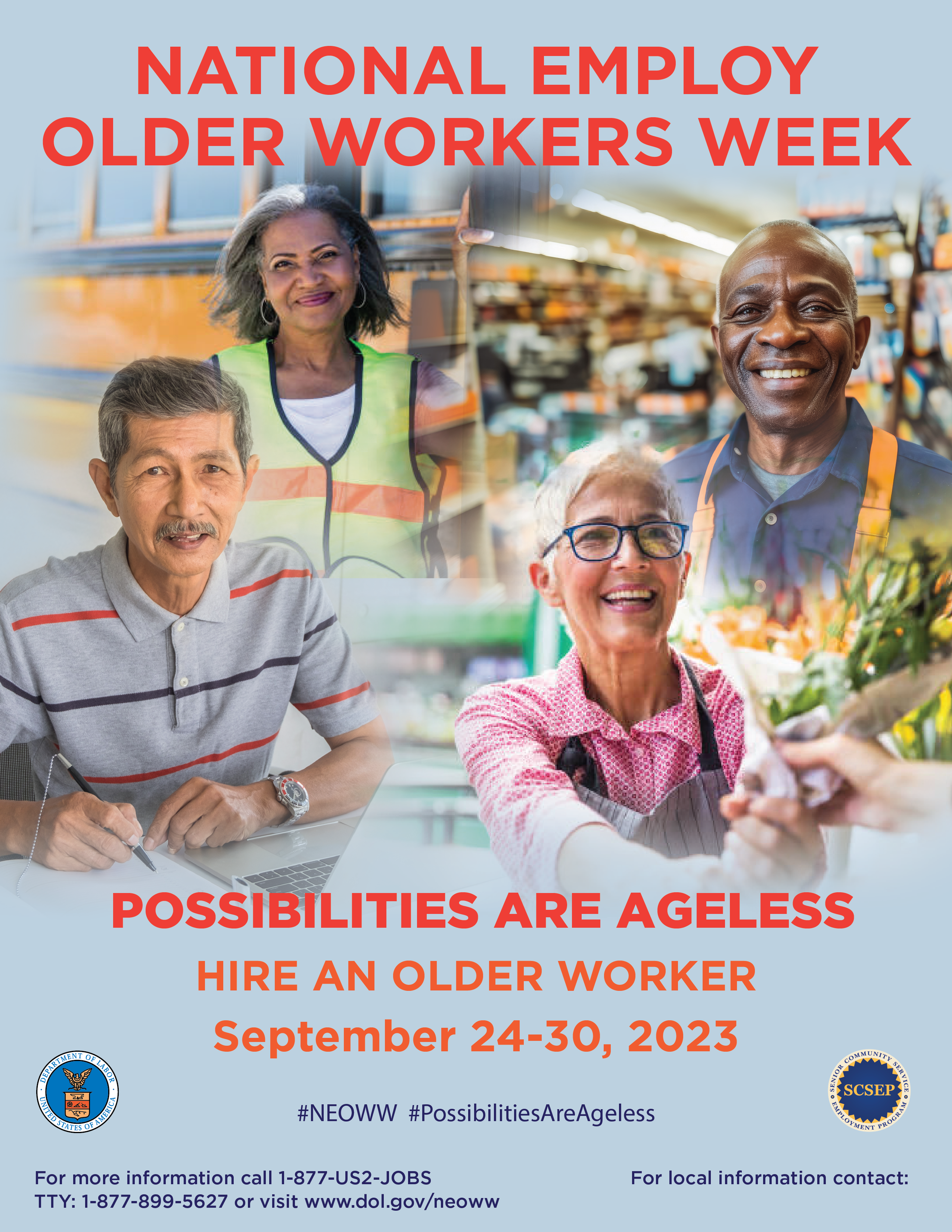 National Employ Older Workers Week, held annually the last full week of September, recognizes the vital role of older workers in the workforce. National Employ Older Workers Week aims to increase awareness of this labor segment and develop innovative strategies to tap it. It also showcases the Senior Community Service Employment Program (SCSEP), which provides on-the-job skills training to individuals 55 or older with limited financial resources. Since its inception, SCSEP has helped over one million older Americans enter the workforce.