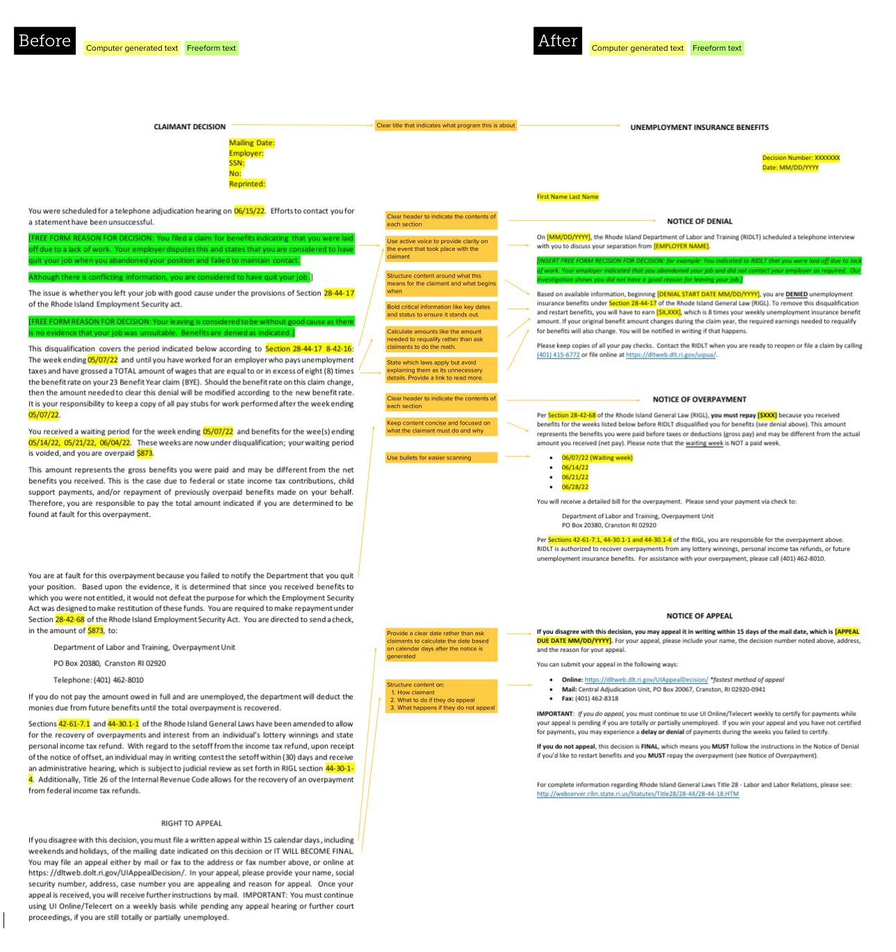 State Workforce Agencies are required to communicate to claimants any information that may affect claimants’ past, present, or future benefits. Such communications can cause claimants undue stress if the information presented is confusing, written at an advanced reading grade level, or too legalistic. Providing concise, reader-focused information helps reduce burden on claimants and results in a more positive customer experience. DLT and USDOL regulatory and policy experts analyzed sample decisions sent to claimants, specifically looking at Notices of Denial, Overpayment, and Appeal, with the intent of rewriting these notices using plainer language