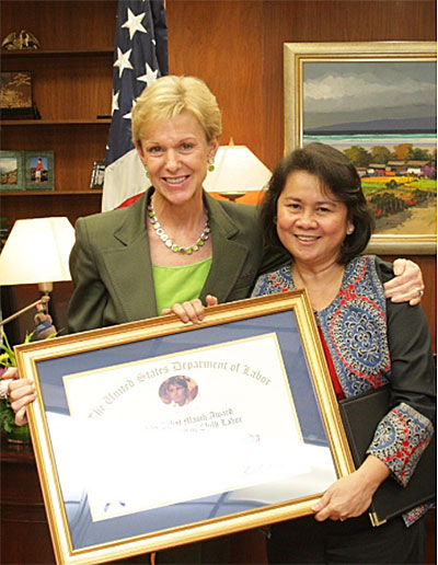The U.S. Department of Labor awarded the first annual Iqbal Masih Award for the Elimination of Child Labor to Maria Cecilia Flores-Oebanda of the Philippines. Ms. Flores-Oebanda, President and Executive Director of the Visayan Forum Foundation, Inc. (VFF) based in Quezon City, dedicated her life to combat the use of child domestic workers and the trafficking of women and children for domestic servitude and commercial sexual exploitation in the Philippines and internationally. "This award recognizes a champion in the fight to end child labor,” said then-U.S. Secretary of Labor Elaine L. Chao. “Ms. Flores-Oebanda has shown through her life and work that children deserve a chance to develop their full potential rather than to be caught up in a bleak existence defined by poverty and exploitive child labor.”