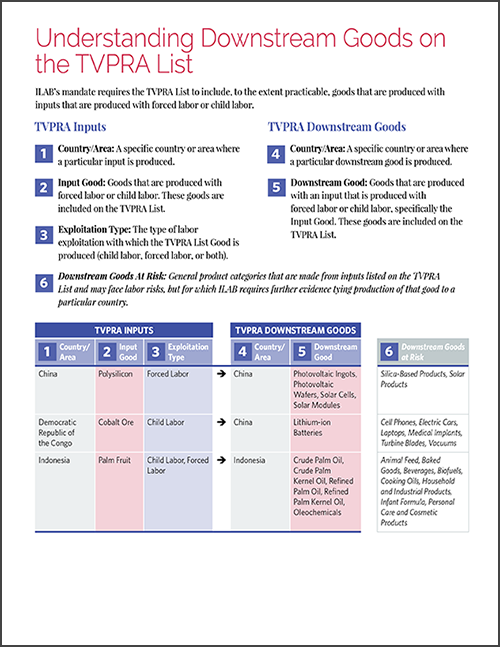 To review the complete list of downstream goods made with inputs produced by child labor or forced, access our List of Goods Produced with Child Labor or Forced Labor and filter by Exploitation Type > "Inputs Produced with Child Labor” or “Inputs Produced with Forced Labor."