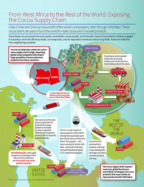 Global supply chains are complex, involving multiple tiers of suppliers across countries and regions. This complexity can obscure unethical practices and labor exploitation. ILAB produces and funds research to expose child and forced labor throughout global supply chains, highlighting where risks occur. For companies, this research helps identify and address labor issues within their supply chains. Governments use it to develop more effective policies and regulations to combat labor exploitation, while consumers are able to make more ethical purchasing decisions.