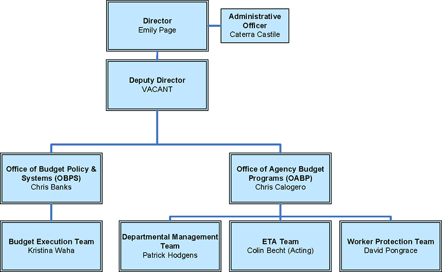 The Departmental Budget Center is under the leadership of Emily Page, Director, who oversees Caterra Castile, Administrative Officer, and Pat Hodgens, Deputy Director. The Deputy Director oversees Chris Banks, Manager of the Office of Budget Policy and Systems (OBPS), and Chris Calogero, Manager of the Office of Agency Budget Programs (OABP).