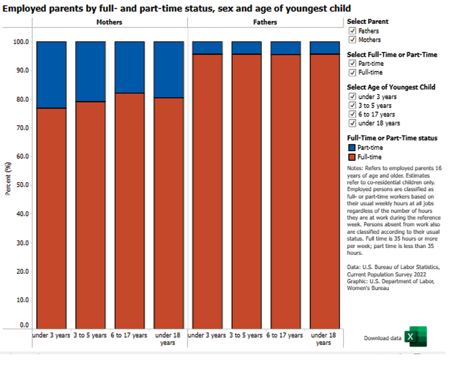 Employed parents by full-time and part-time status, sex and age of youngest child