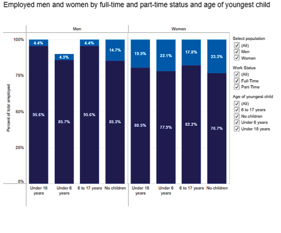 Employed men and women by full-time and part-time status and age of youngest child