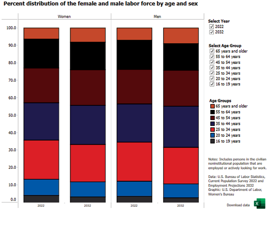 Percent distribution of the female and male labor force by age and sex