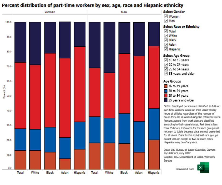 Percent distribution of part-time workers by sex, age, race and Hispanic ethnicity