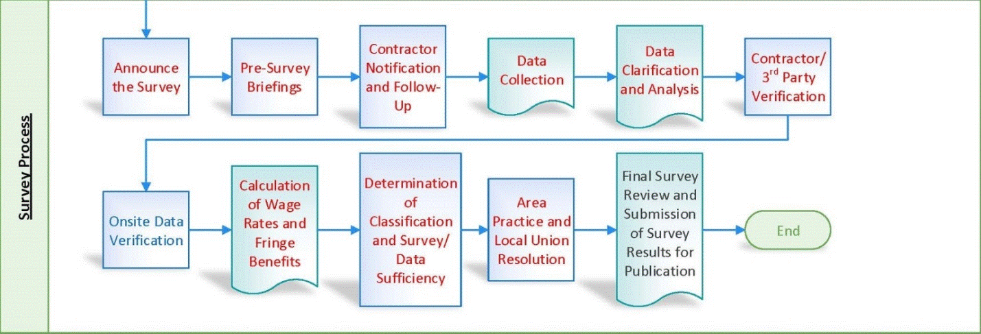 - Collect and analyze data: The Branch of Wage Surveys contacts contractors and interested parties to collect the survey data and then analyzes the collected survey data to determine prevailing wages.