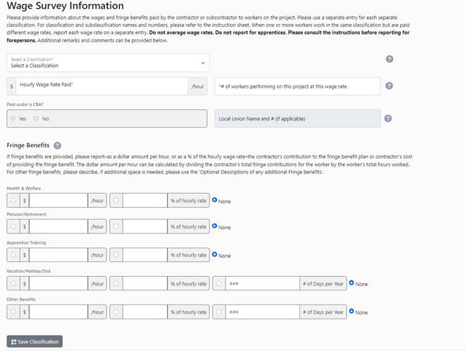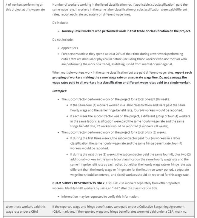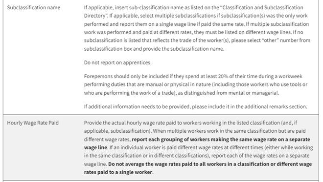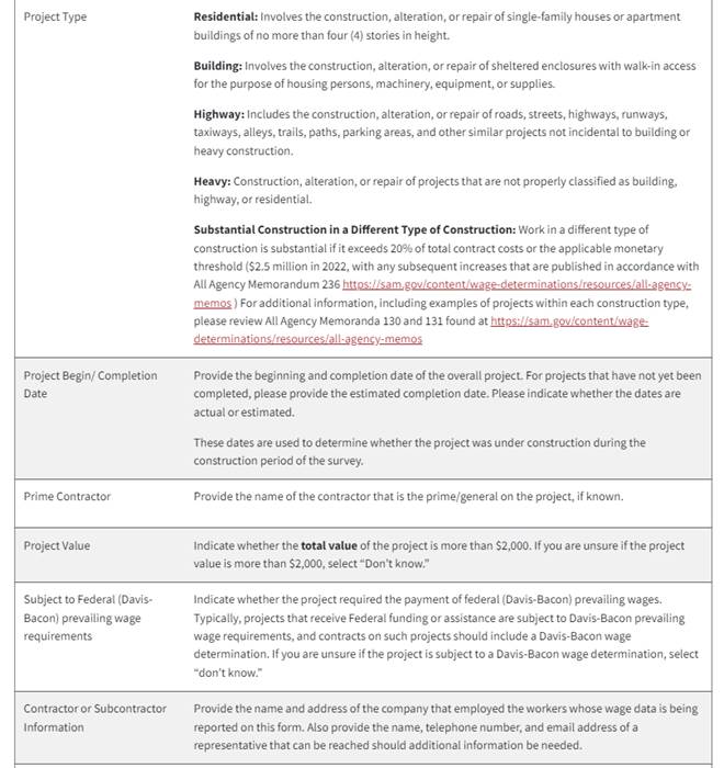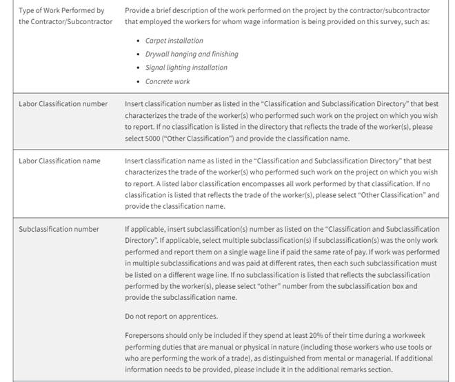 - The information submitted should reflect the wage rates paid to workers employed in a particular classification in an area, the type or types of construction on which such rates are paid, and whether or not such wage rates were paid on Federal or federally assisted projects subject to Davis-Bacon prevailing wage requirements.