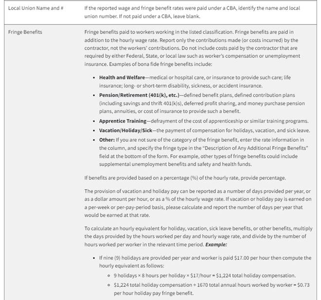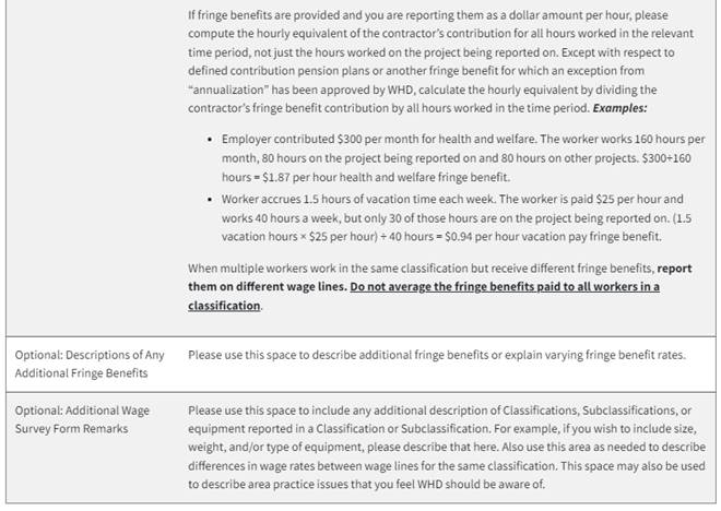 - Wage and fringe benefit data are collected from construction contractors and other interested parties on Form WD-10, an electronic version of which is found at: http://www.dol.gov/whd/programs/dbra/WD10Instrctns/wd10instructions.htm .