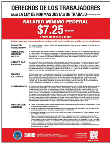 Cada empleador sujeto a la Ley de Normas Justas de trabajo debe exhibir un cartel en todos los establecimientos, en un lugar donde los empleados puedan verlo fácilmente. El contenido del cartel es determinado por la Oficina de Horarios y Salarios del Departamento de trabajos de los Estados Unidos. Una copia aprobada es disponible para propositos informativos o para su uso como cartel.