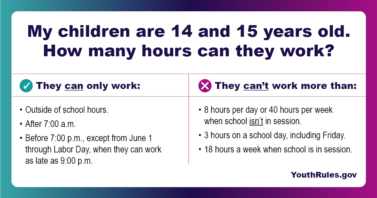 - Does your 14- or 15-year-old child want a job bussing tables? Bagging groceries? Working at a local pool, marina, or golf course? Know the federal limits on their hours and tasks. YouthRules.gov