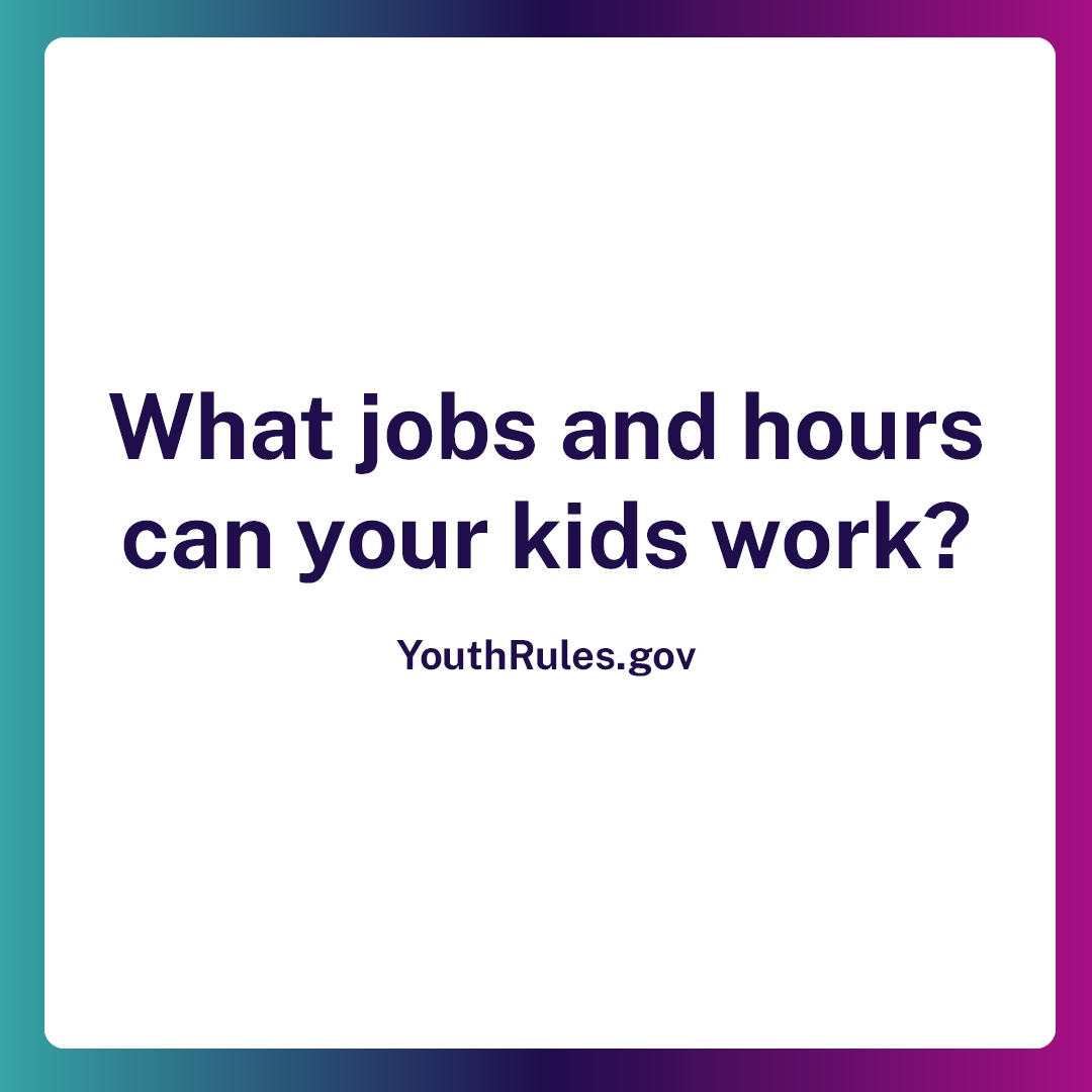 - .@WHD_DOL enforces federal child labor laws to ensure that when young people work, the work is safe and doesn't jeopardize their health, well-being or educational opportunities. Learn more: YouthRules.gov