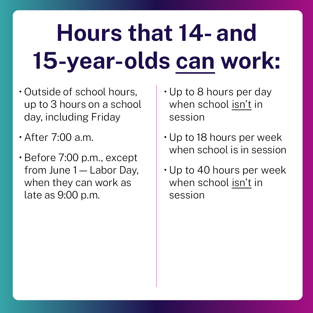 - Did you know there are different restrictions to the hours that 14- and 15-year-olds can work when school is in session? Check out our short guide to make sure you're following the law. https://www.dol.gov/agencies/whd/child-labor/short-guide-to-child-labor-non-ag
