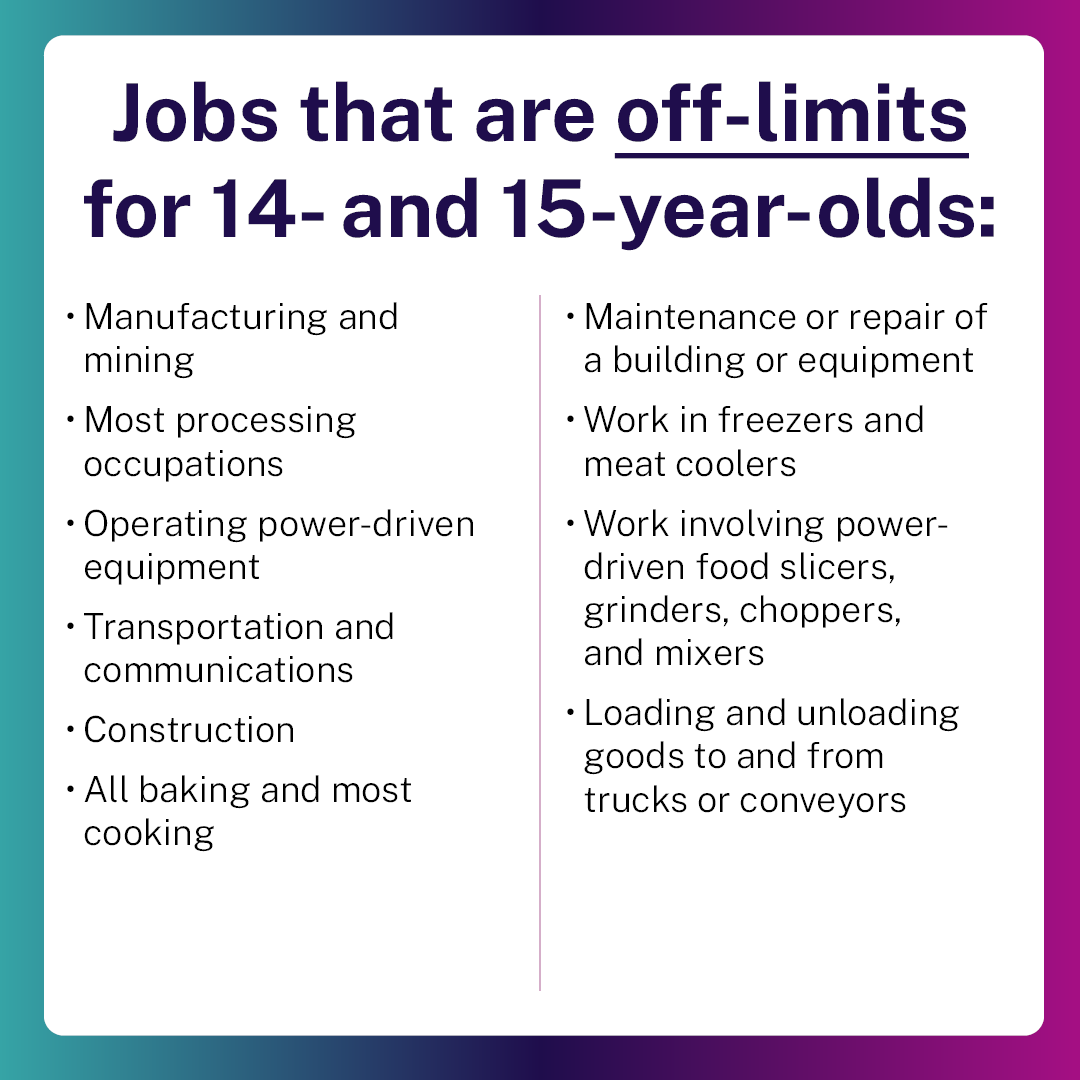 - Does your 14- or 15-year-old child want a job bussing tables? Bagging groceries? Working at a local pool, marina, or golf course? Know the federal limits on their hours and tasks. YouthRules.gov