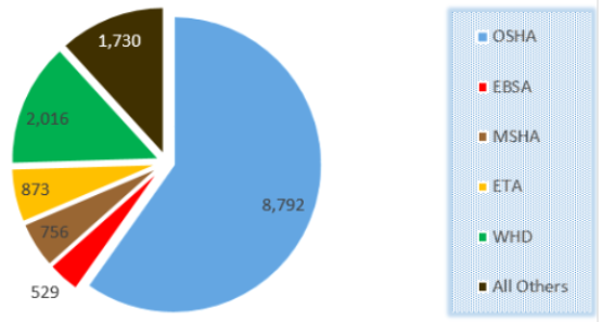 During Fiscal Year 2018, the U.S. Department of Labor received 14,696 FOIA requests and processed 14,679 requests. As demonstrated in the table below, the majority of the requests received were by the Occupational Safety and Health Administration (OSHA – 60%), followed by the Wage and Hour Division (WHD – 14%), Employment and Training Administration (ETA – 6%), Mine Safety and Health Administration (MSHA – 5%) and the Employee Benefits Security Administration (EBSA - 3%). The remaining 12 percent of the Department’s requests were received by the other 18 agency components.